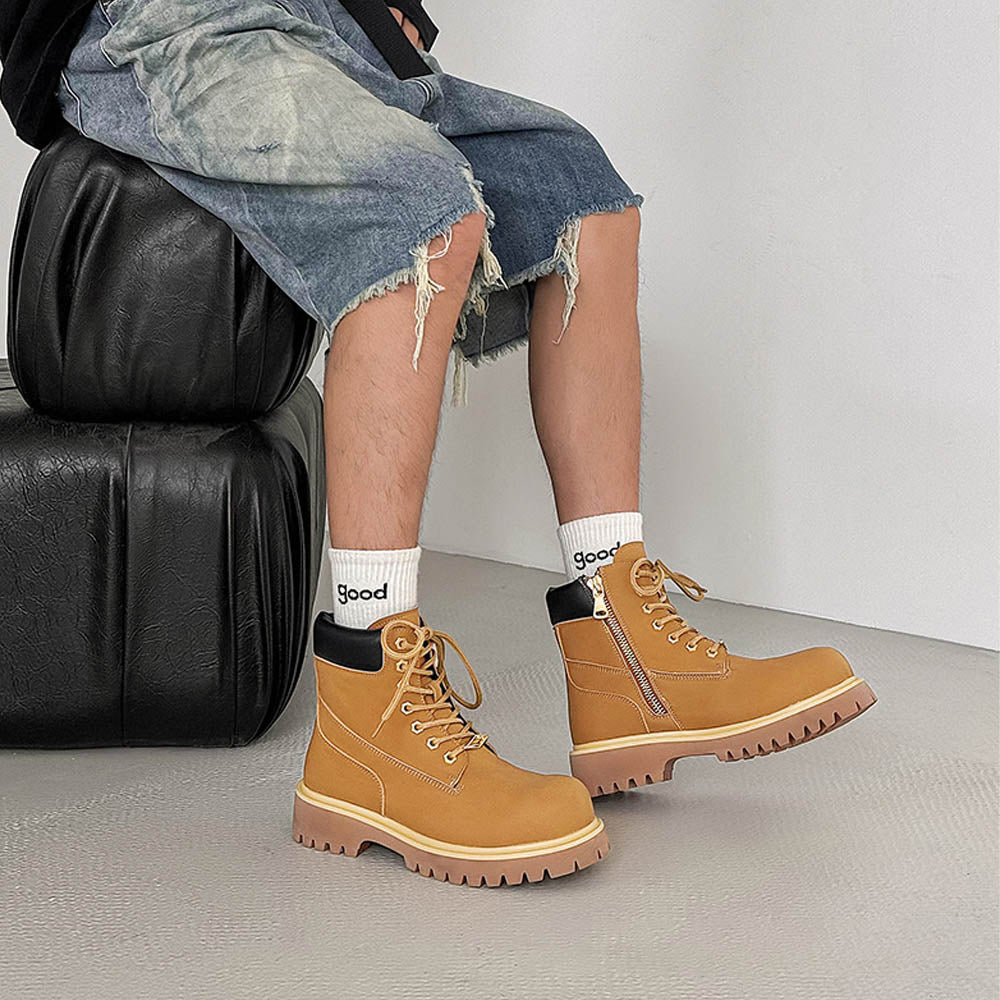 Introducing our rugged Outlander Lace-Up Boots. These retro-inspired boots are made from mixed materials and feature a durable rubber sole for superior grip and resilience. The round-toe design, along with a medium heel height, provides optimal support for all-day wear, while the high tube height ensures warmth and protection in cold weather. The insole is crafted from soft textiles, and the mesh lining enhances breathability, making these boots ideal for long walks or outdoor activities. Engineered with viscose sole technology, the Outlander Lace-Up Boots keep your feet warm without sacrificing style. The side zipper detail and stitching elements add to their unique design.